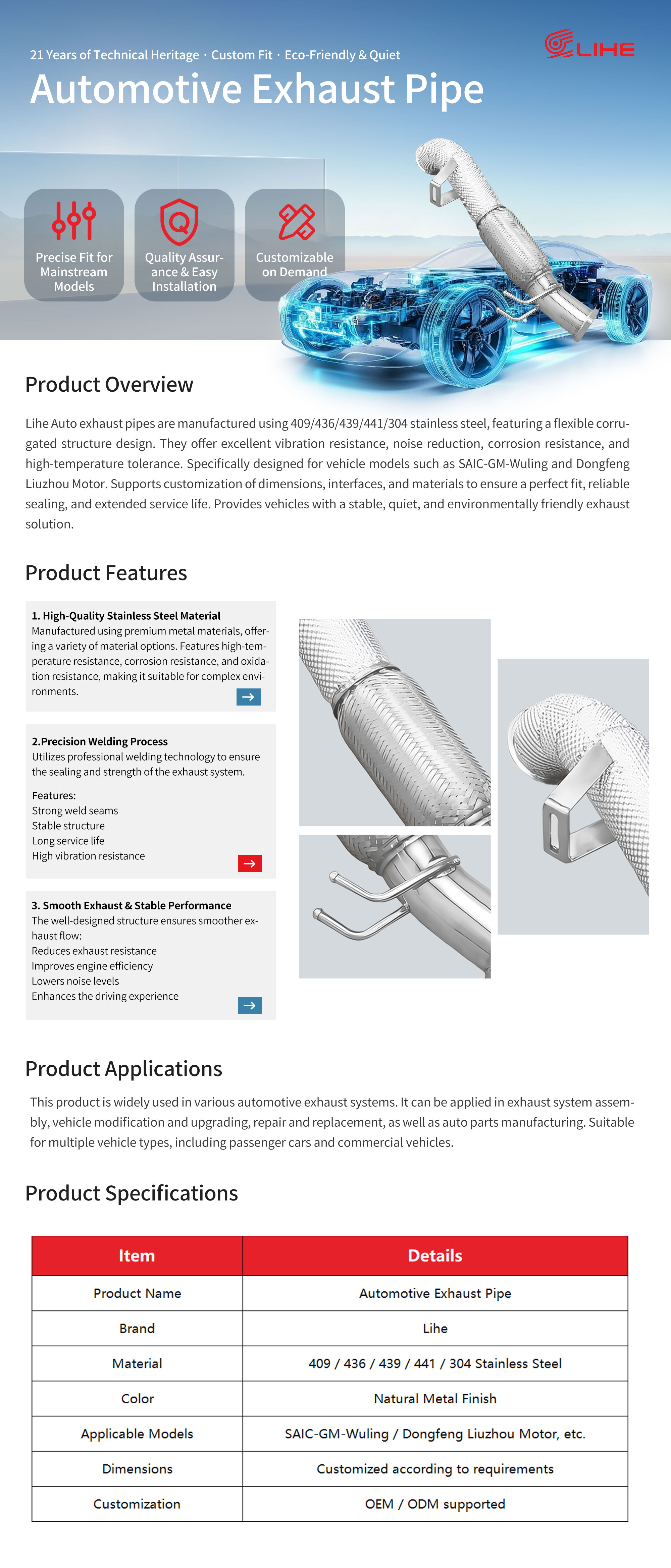 Lihe Auto exhaust pipes are manufactured using 409/436/439/441/304 stainless steel, featuring a flexible corrugated structure design. They offer excellent vibration resistance, noise reduction, corrosion resistance, and high-temperature tolerance. Specifically designed for vehicle models such as SAIC-GM-Wuling and Dongfeng Liuzhou Motor. Supports customization of dimensions, interfaces, and materials to ensure a perfect fit, reliable sealing, and extended service life. Provides vehicles with a stable, quiet, and environmentally friendly exhaust solution.