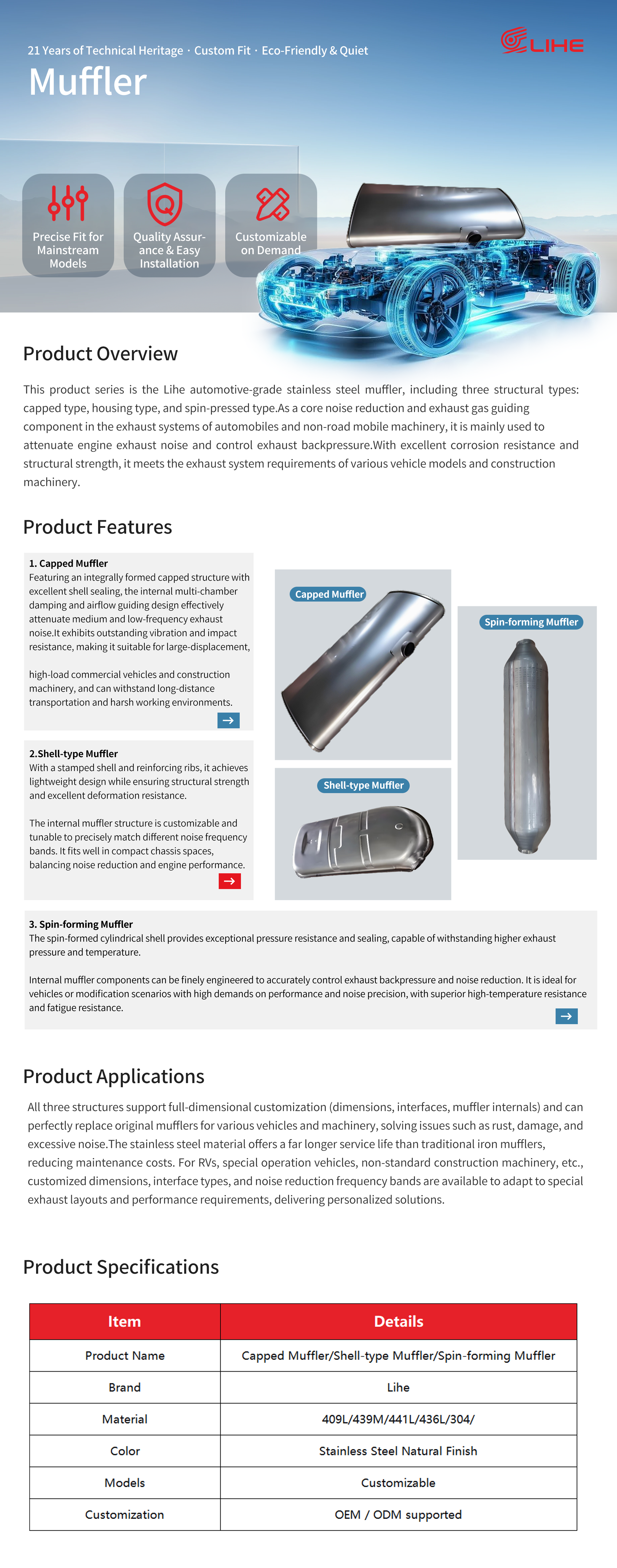 This product series is the Lihe automotive-grade stainless steel muffler, including three structural types: capped type, housing type, and spin-pressed type.As a core noise reduction and exhaust gas guiding component in the exhaust systems of automobiles and non-road mobile machinery, it is mainly used to attenuate engine exhaust noise and control exhaust backpressure.With excellent corrosion resistance and structural strength, it meets the exhaust system requirements of various vehicle models and construction machinery.